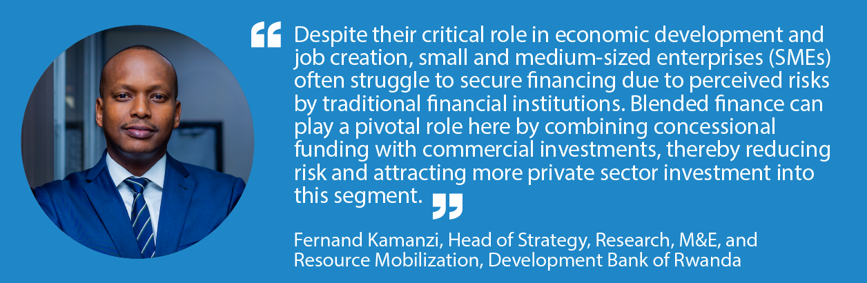 One of the primary gaps in the blended finance market in Rwanda is the limited access to capital for SMEs. Despite their critical role in economic development and job creation, SMEs often struggle to secure financing due to perceived risks by traditional financial institutions. Blended finance can play a pivotal role here by combining concessional funding with commercial investments, thereby reducing risk and attracting more private sector investment into this segment.